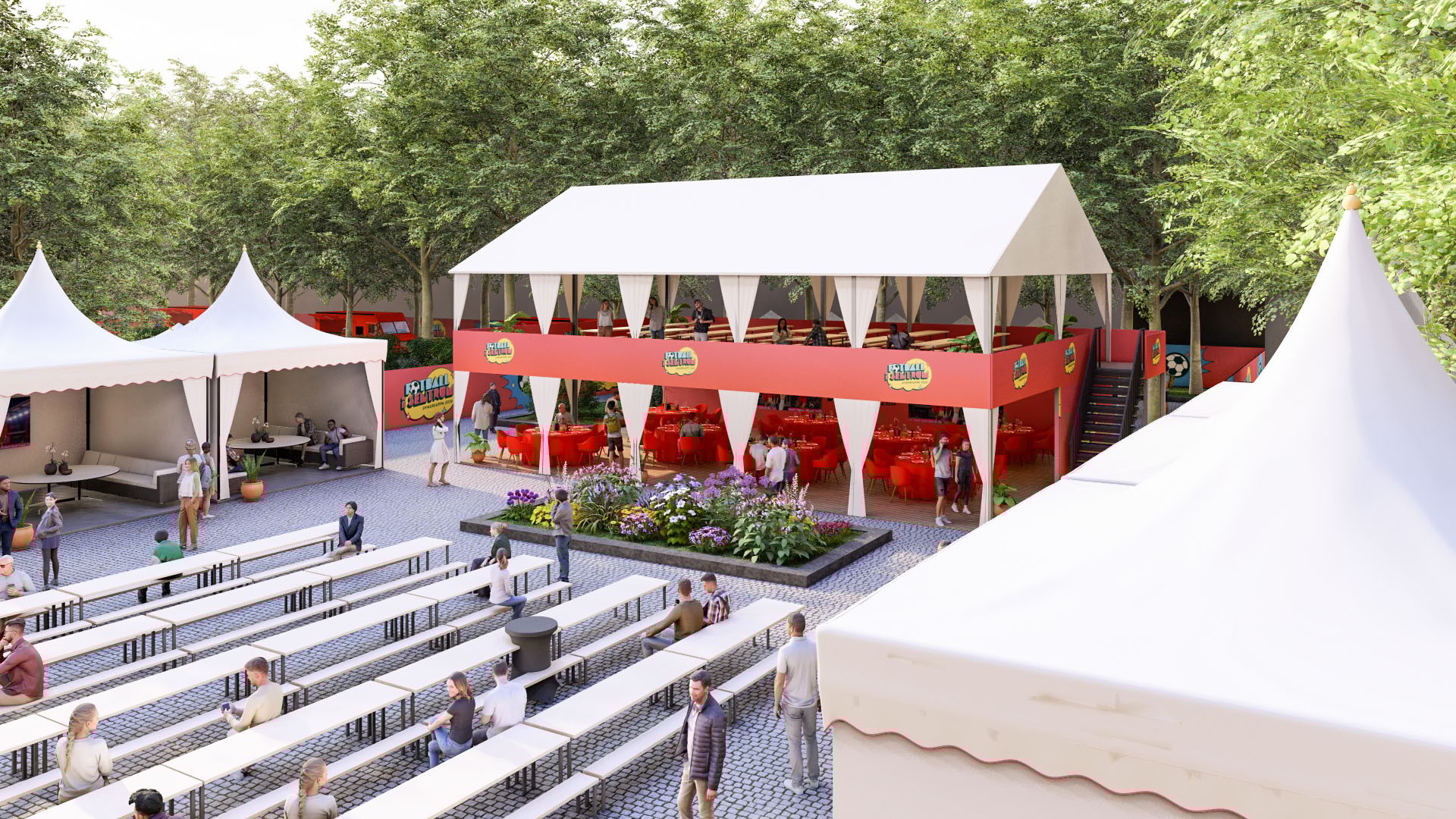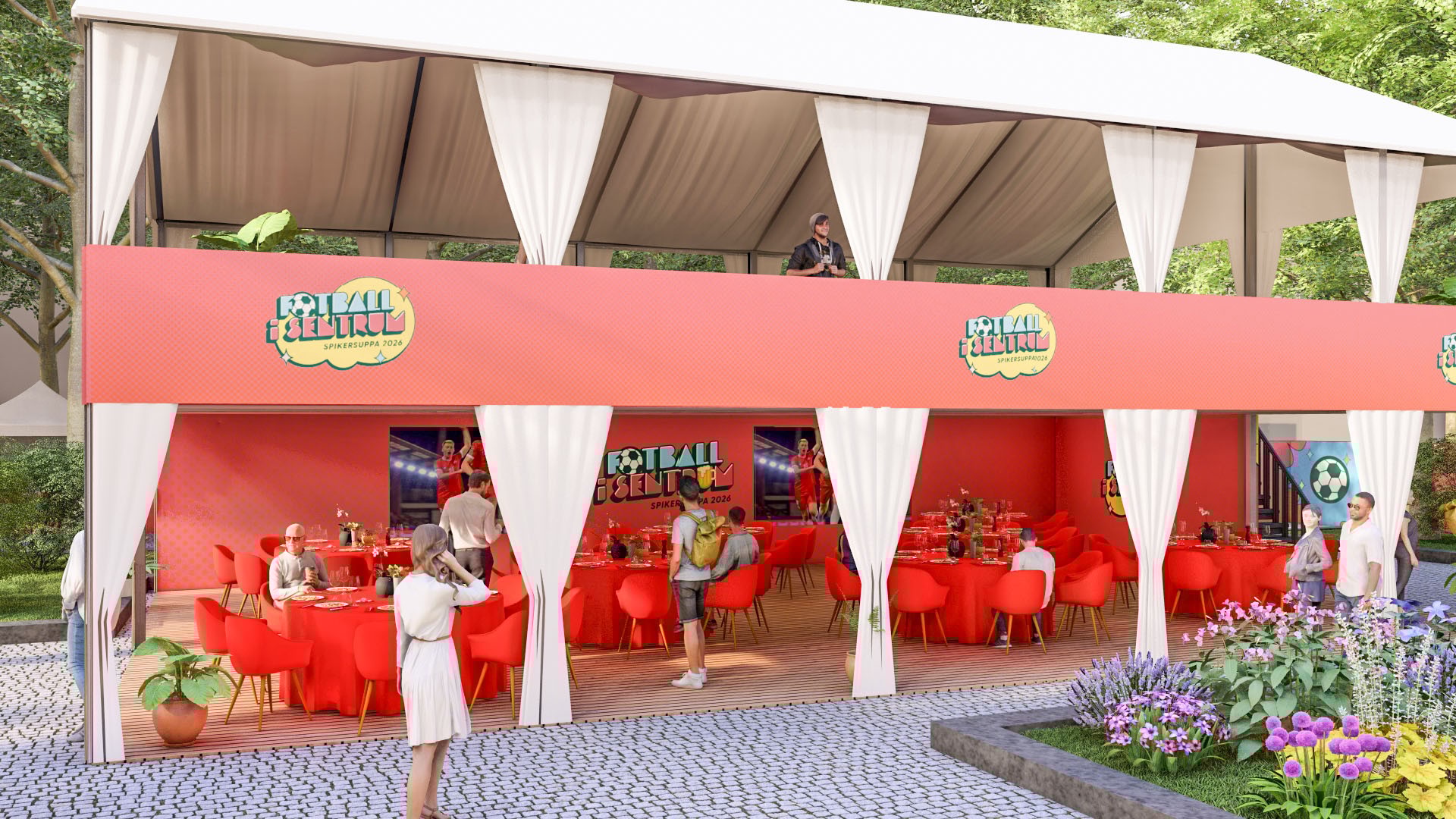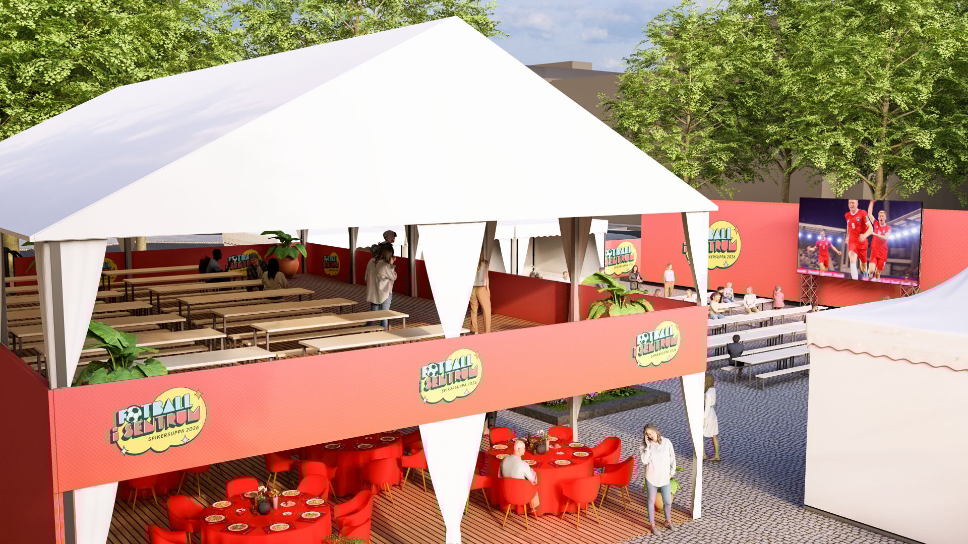 Fra langbordene i 2. etasje i VIP-teltet har du fri sikt til spenningen på storskjermen. Garantert plass til 8 personer. Servering ved ankomst inkludert.