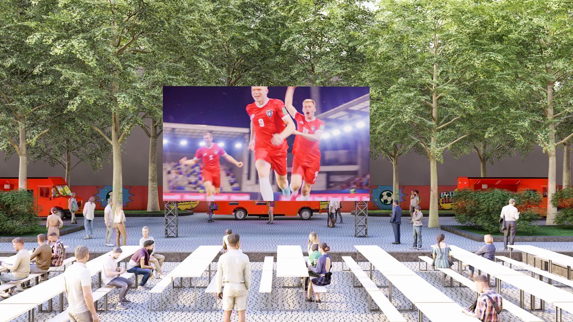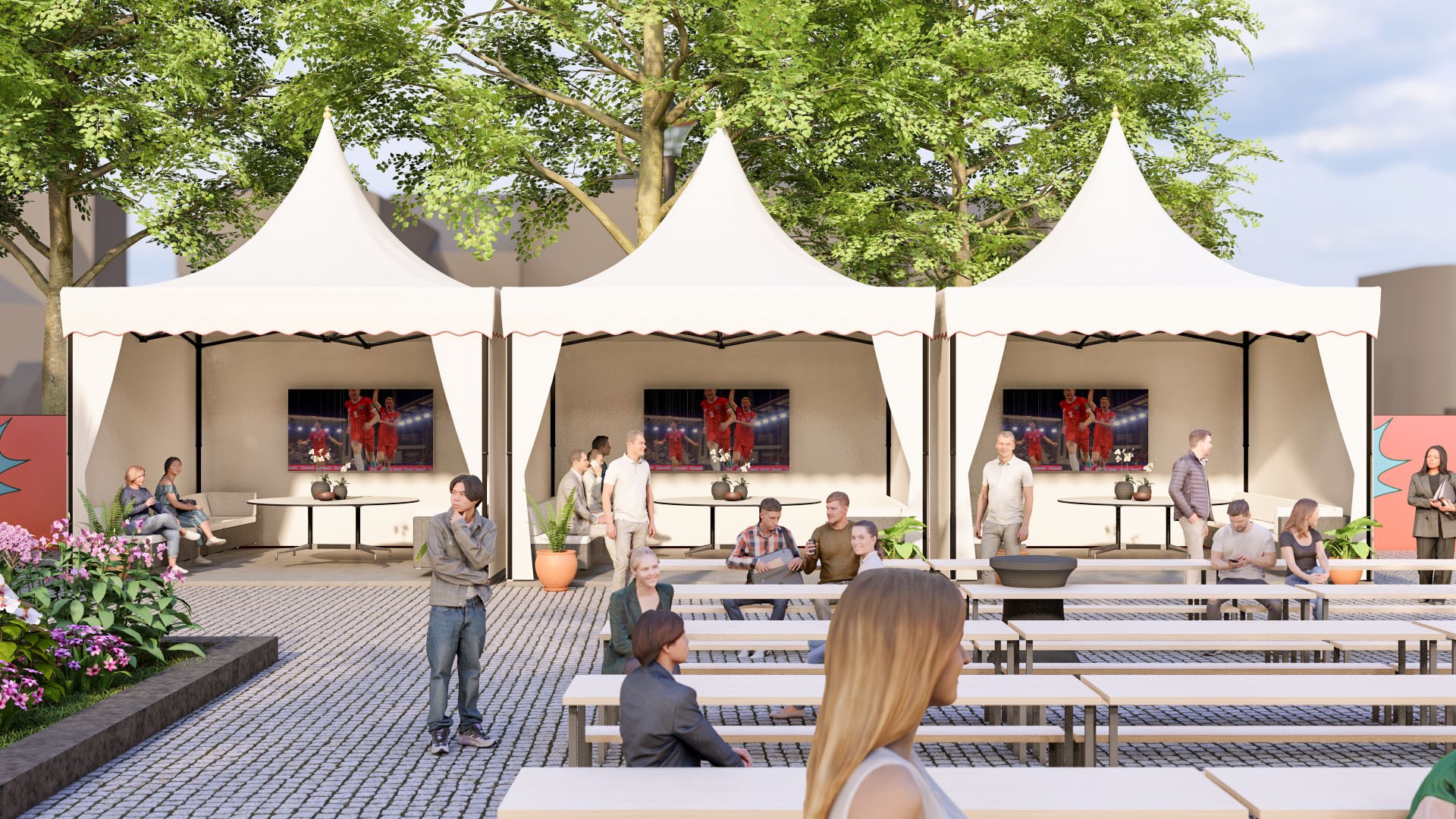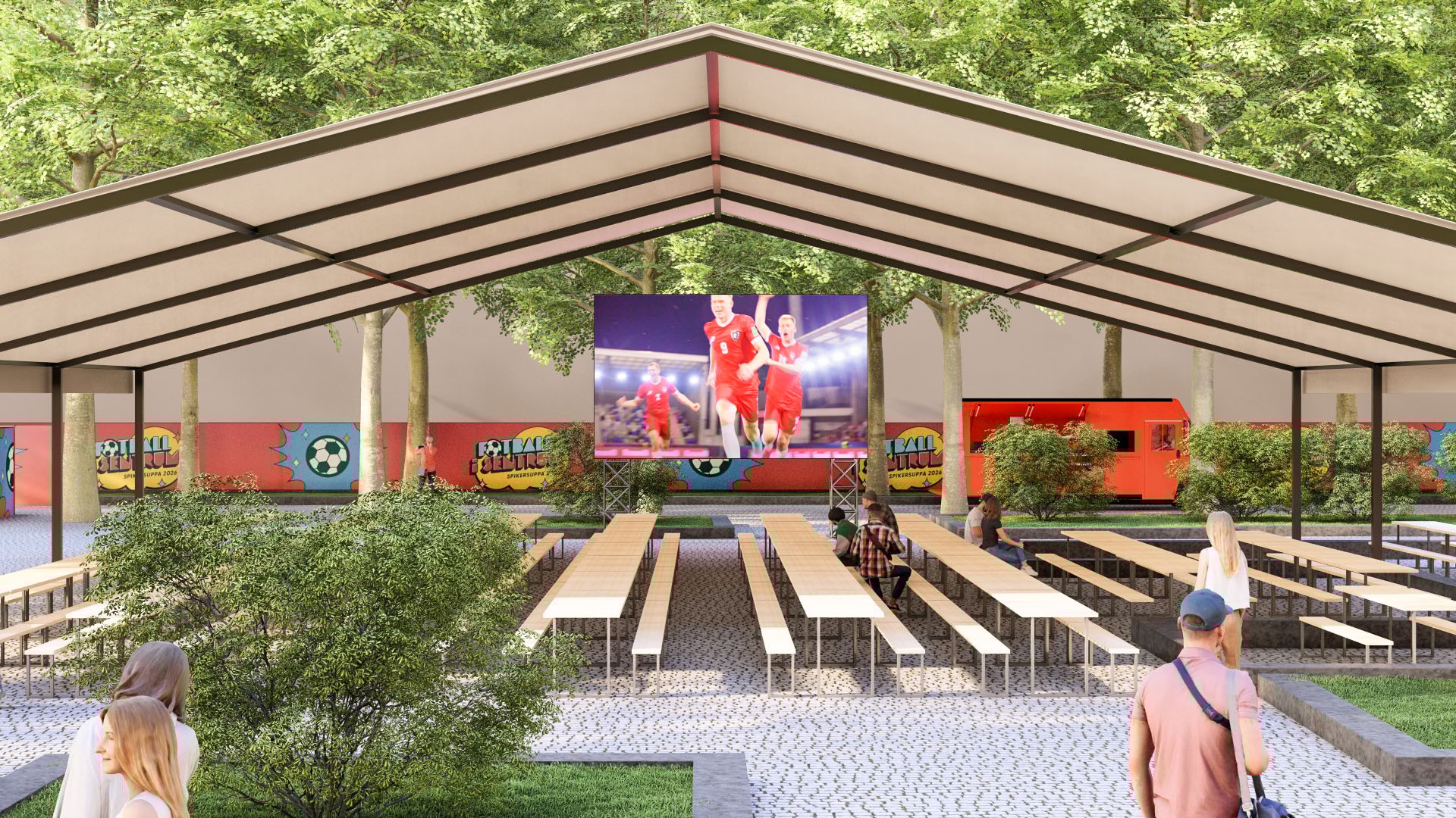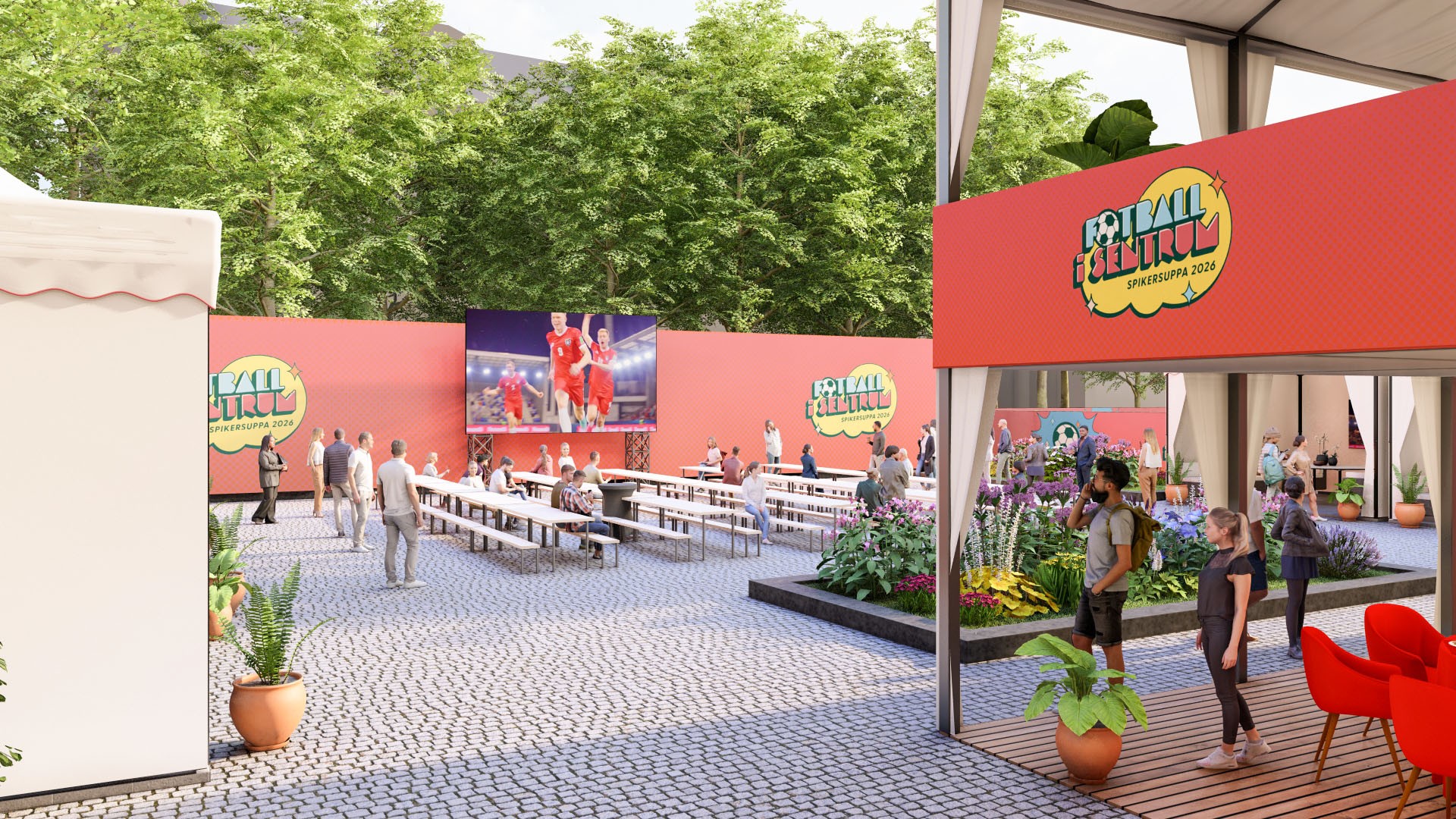 Opplev kampen fra eget cabana-telt nærme storskjermen, med 8-mannsbord, egen TV-skjerm og dedikert servitør. Servering ved ankomst inkludert.